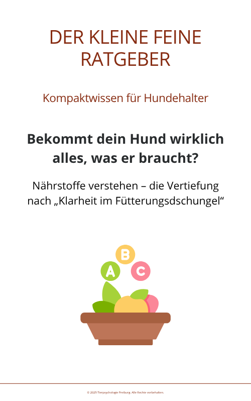 Sie lernen, Zusammenhänge besser zu verstehen, Angaben auf Futtermitteln richtig einzuordnen und Entscheidungen mit mehr Sicherheit zu treffen – damit die Fütterung im Alltag klar, nachvollziehbar und passend für Ihren Hund wird.